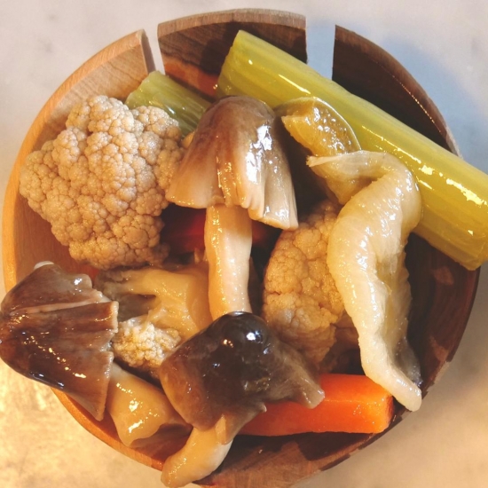 volvacea),cavolfiore, cipolle, carote, peperoni, SEDANO):59%, olio di oliva 41%,sale, aceto di vino(contiene SOLFITI), spezie naturali.